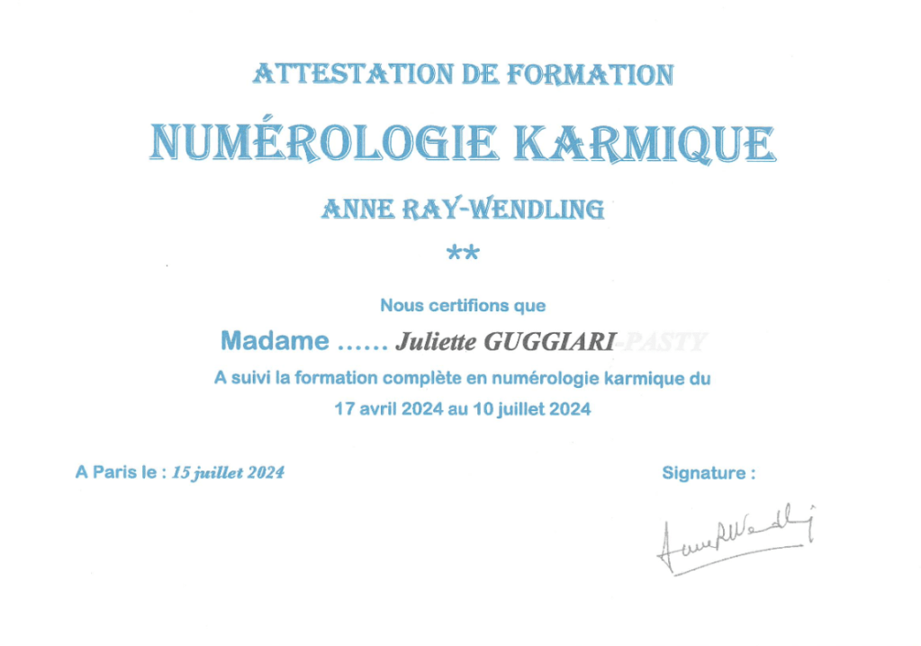 J’ai été formée par Anne Ray-Wendling et j’ai obtenu ma certification de «Numérologue karmique» en 2024.